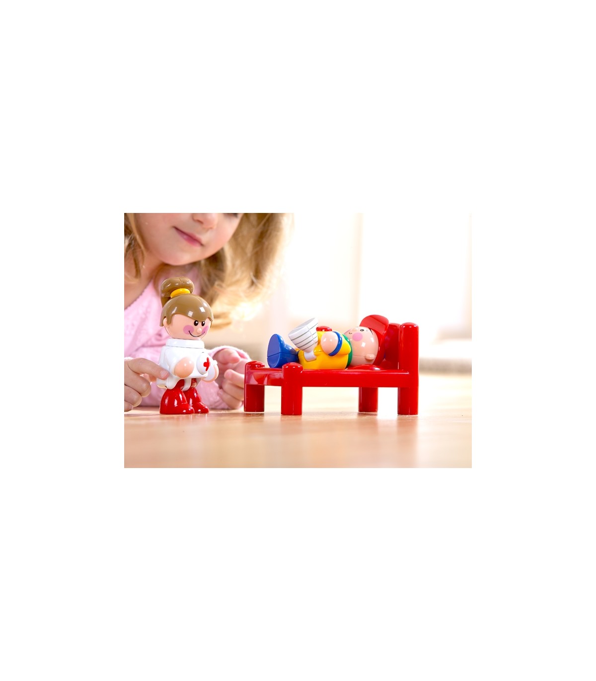 در ابتدا به کودک فرصت دهید تا خودش به تنهایی بازی را کشف کند. در صورت نیاز او را برای کشف صدای جغجغه و حرکت سر عروسک راهنمایی کنید. از او بخواهید تا نقش یک دکتر را بازی کند و از آدمک سوالات اولیه مانند : آیا می توانی سر خود را تکان بدی؟ یا چه مشکلی برای شما پیش آمده؟ استفاده کند.