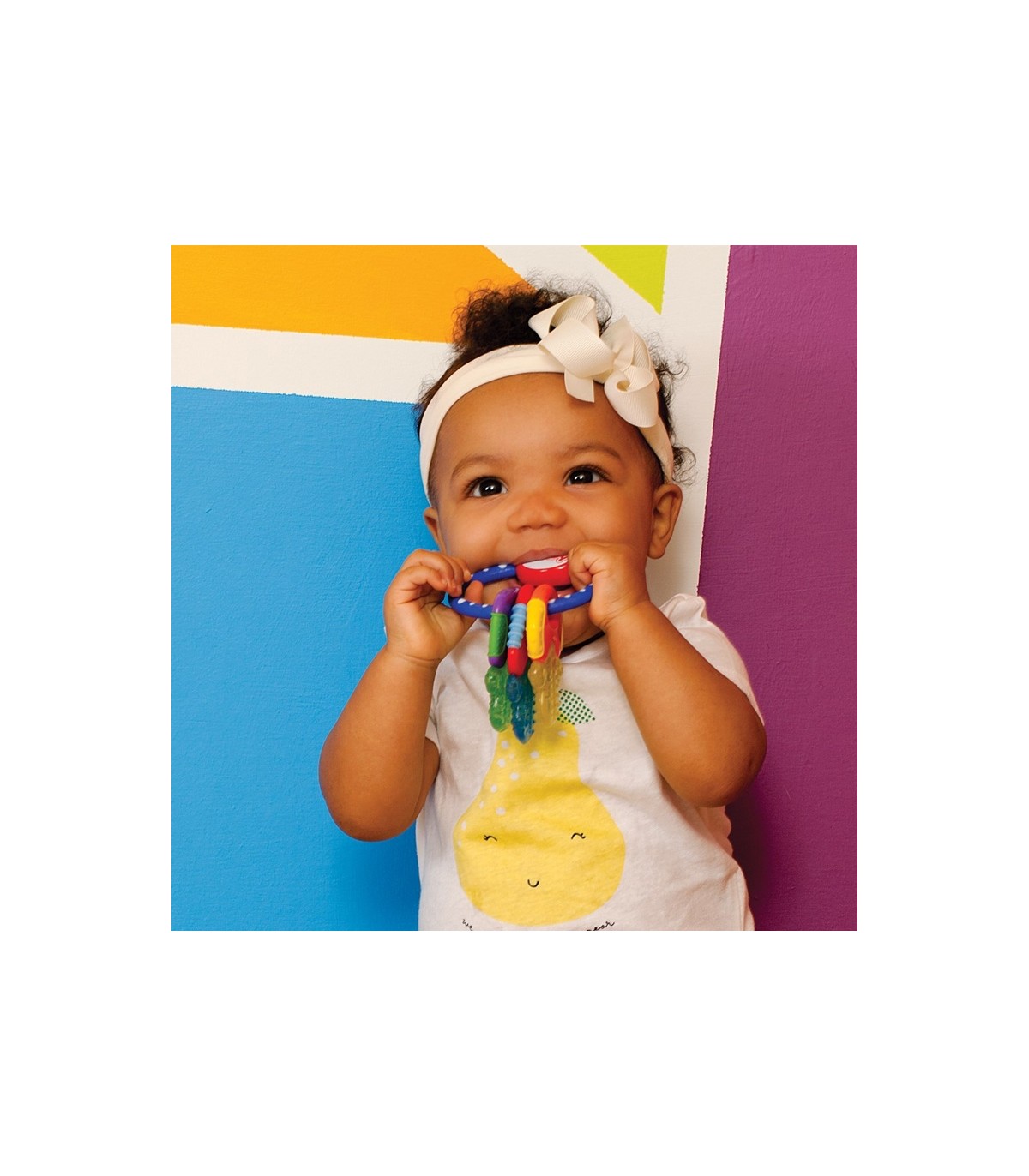 • در عین اینکه اشکال رنگارنگ این کلید ها کودک را بطور بصری تحریک می کند، سطوح بیرونی برجسته آنها با ماساژ آرام لثه های کودک به خروج دندان های جدید وی یاری می رساند.