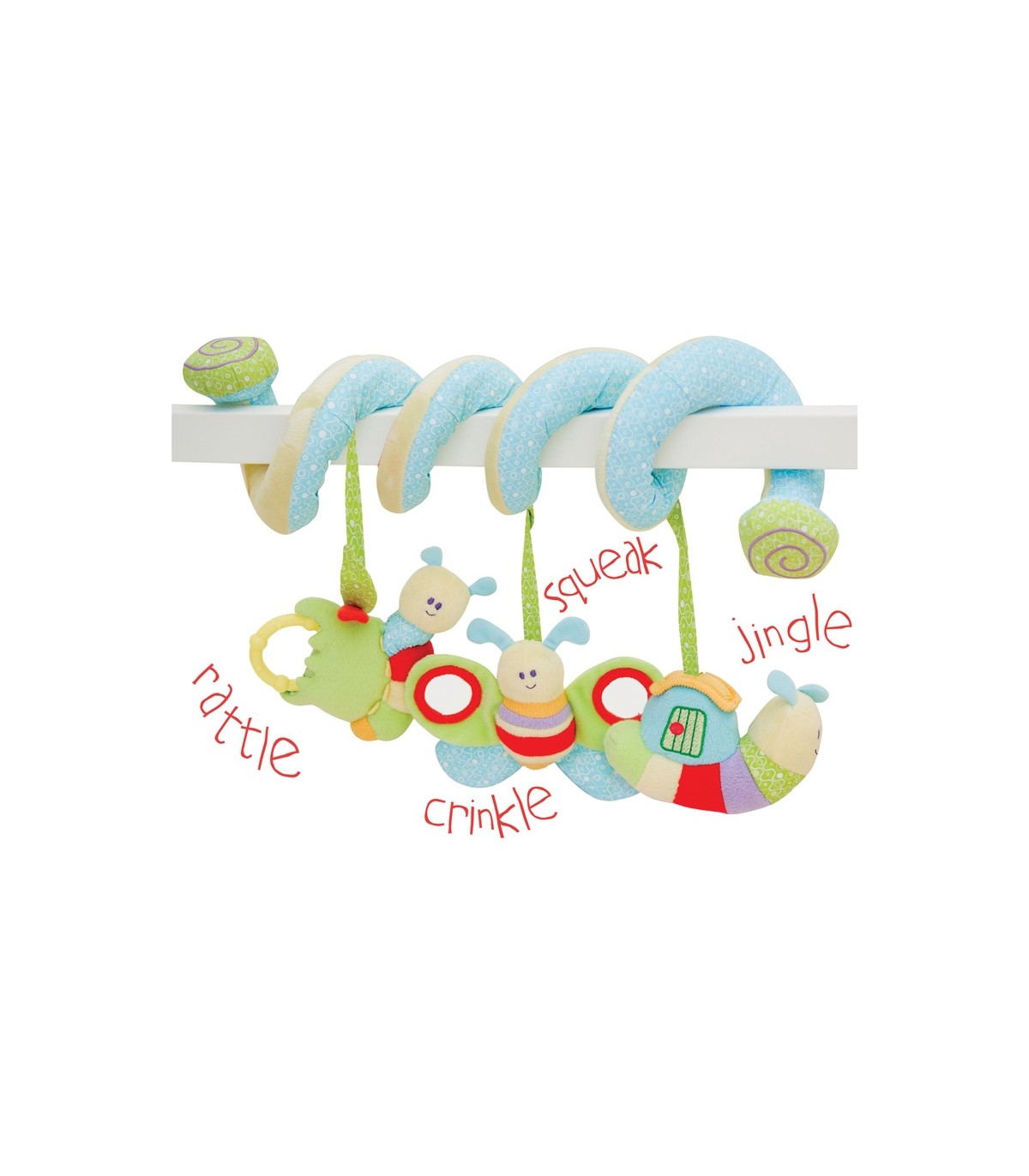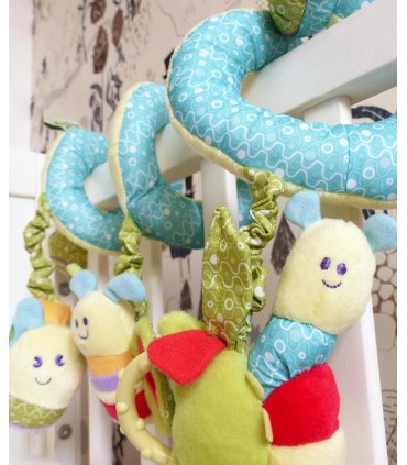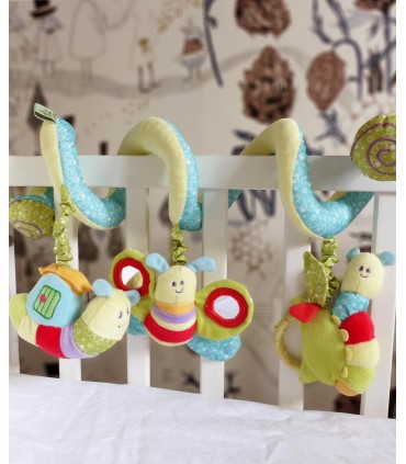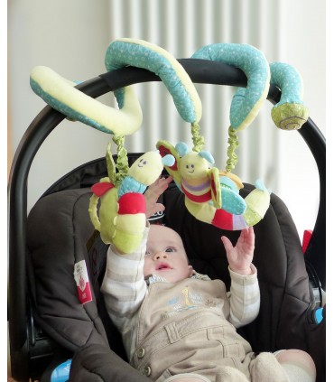 این اسباب بازی مارپیچ را به راحتی می توانید دور دسته صندلی اتومبیل، میله کالسکه، تشک بازی، لبه ننوی کودک و دسته کریر بپیچید و اجازه دهید تا کودک از دیدن عروسک های نرم و مختلف، آینه های روی عروسک، پیچ وتاب، صدای جغجغه و آهنگ آن لذت ببرد.