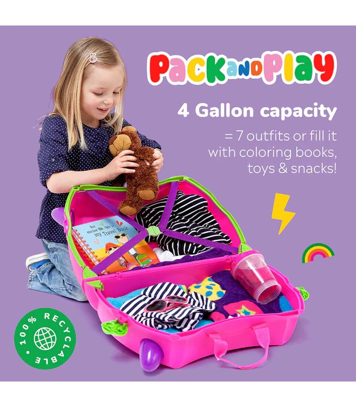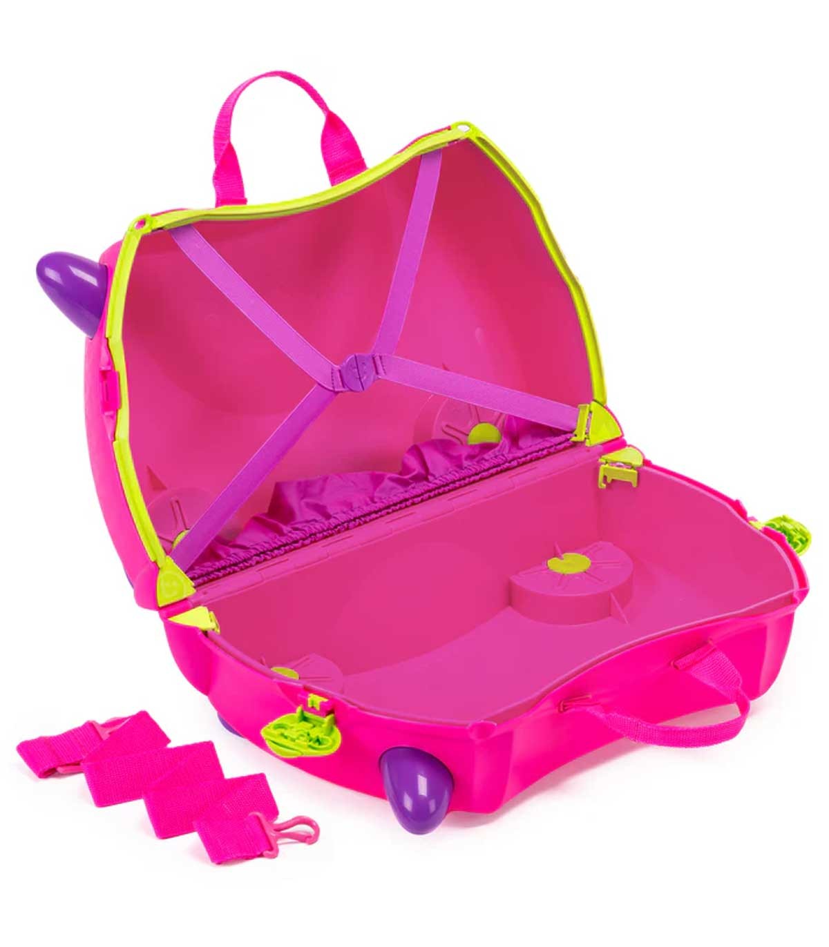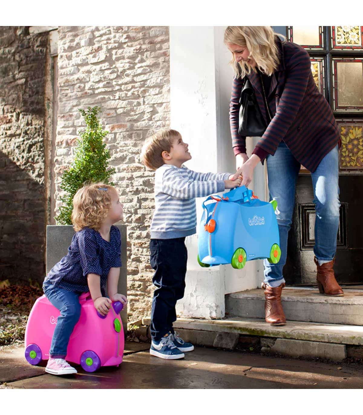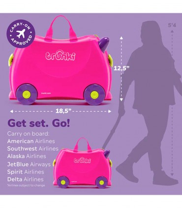 قابلیت سوار شدن کودک بر روی چمدان (تحمل وزن تا 50 کیلوگرم) و کشیده شدن توسط والدین به وسیله بند مخصوص