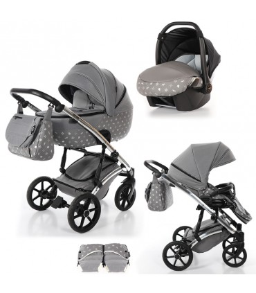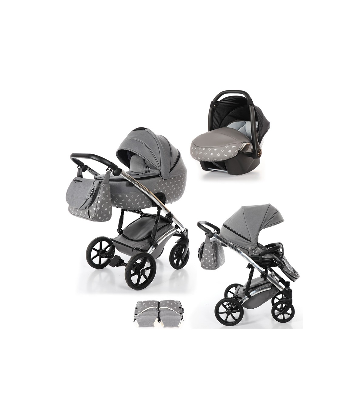 این ست بسیار زیبا و کاربردی شامل کالسکه، کریر، کریکات، ساک لوازم، دستکش زمستانی، کاور گرمکن پا، کاور باران و پشه بند است.