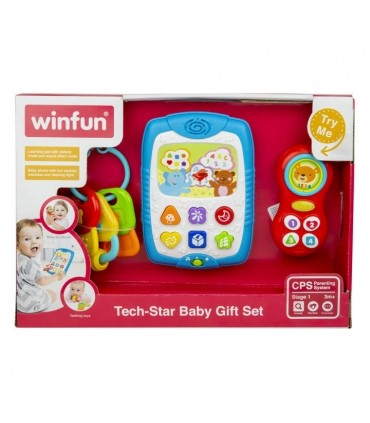 هدف برند وین‌فان طراحی اسباب‌بازی سرگرم کننده و در عین حال آموزشی است. ست تبلت و موبایل و دندانی نوزادی یک هدیه عالی برای نوزادان سه ماه به بالا است که شامل یک تبلت با ملودی و جلوه‌های صوتی و نور چشمک‌زن، 3 عدد کلید دندانی و موبایل با ملودی‌های سرگرم‌کننده و نور چشمک‌زن است. بازی کردن با نوزادان از بدو تولد و درگیر کردن حواس پنج‌گانه و توجه نوزاد و گرفتن پاسخ از نوزاد با همان زبان نوزادی در فعال کردن نرون‌های مغزی نوزاد بسیار موثر است. استفاده از اسباب‌بازی‌هایی که توجه و حواس نوزاد را درگیر می‌کند در تسهیل این کار بسیار به پدر و مادر کمک می‌کند. تبلت اسباب بازی وین فان در این ست نوزادی، شش دکمه موزیکال دارد و چراغدار است. هر دکمه برای برانگیختن حواس ملودی متفاوتی را پخش می‌کند. موبایل دارای 4 دکمه بزرگ و یک چراغ در وسط آن است. ست تبلت و موبایل و دندانی نوزادی وین‌فاندارای برچسب استیج اول CPS در محصولات وین‌فان است. این برچسب برای نوزادان 3 ماه به بالا است و در این اسباب‌بازی هدف برانگیختن حس کنجکاوی برای حل مساله و تقویت مهارت‌های شناختی عنوان شده‌ است. نوزادان در این سن دوست دارند بافت‌های مختلف را لمس کنند و چه خوب است وسیله‌ای که در اختیار دارند ایمن و بهداشتی باشد. ست تبلت و موبایل و دندانی نوزادی یک پکیج پیشنهادی ایمن و بهداشتی است و با هدف تقویت عضلات دست و تمرین برای در دست گرفتن اشیا و استفاده از انگشتان طراحی شده و هم نیاز نوزاد برای به دهن بردن اشیا و وسایل را برطرف می‌کند. از سه ماهگی به بعد نوزادان ممکن است علایم آمادگی لثه برای رویش دندان را نشان بدهند و هر وسیله‌ای را به سمت دهان خود ببرند، استفاده از دندان‌گیر نوزاد به شرط بهداشتی بودن و استفاده از مواد درجه یک در پلاستیک داندان‌گیر بسیار کمک‌کننده است. استفاده از کلیدهای دندان‌گیر اینست در حین بازی می‌تواند هم بهداشتی و آرامش‌دهنده و هم سرگرم‌کننده باشد.