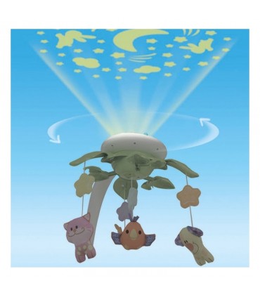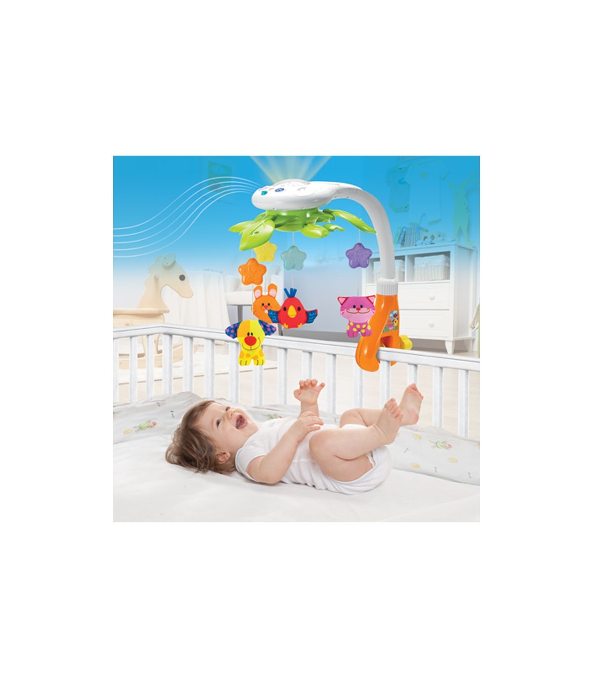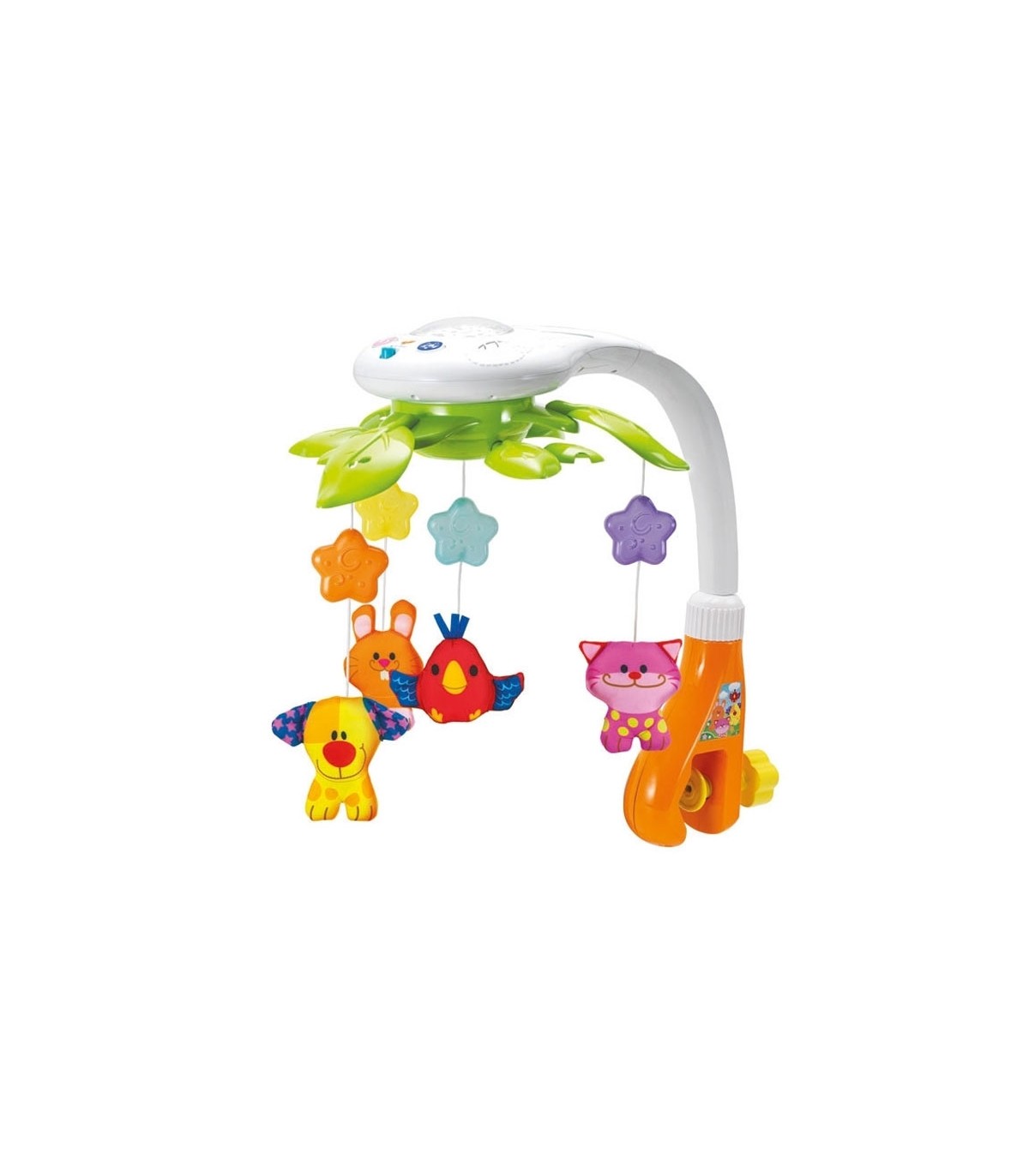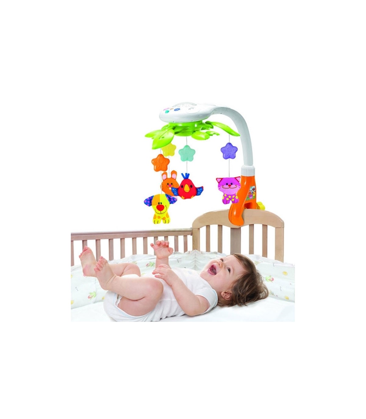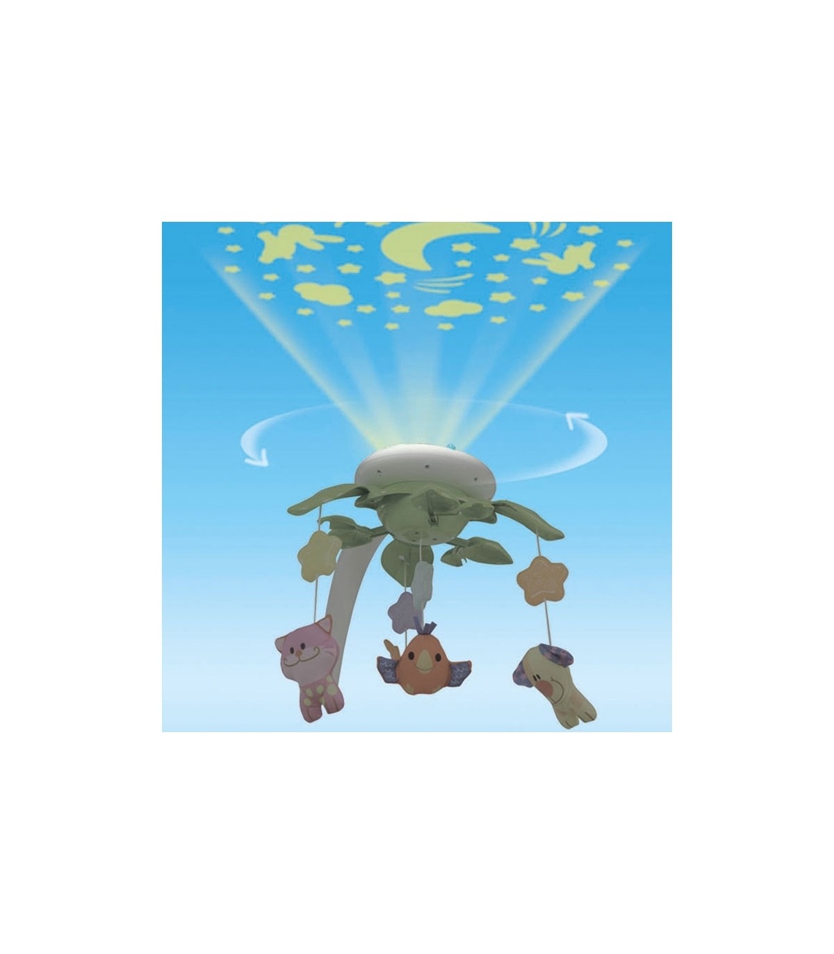 • دارای دکمه روشن و خاموش برایفعال کردن موزیک و صداها، 4 عروسک پولیشی چرخشی، قابلیت پخش نور روی سقف همراه لالایی و صدای طبیعت