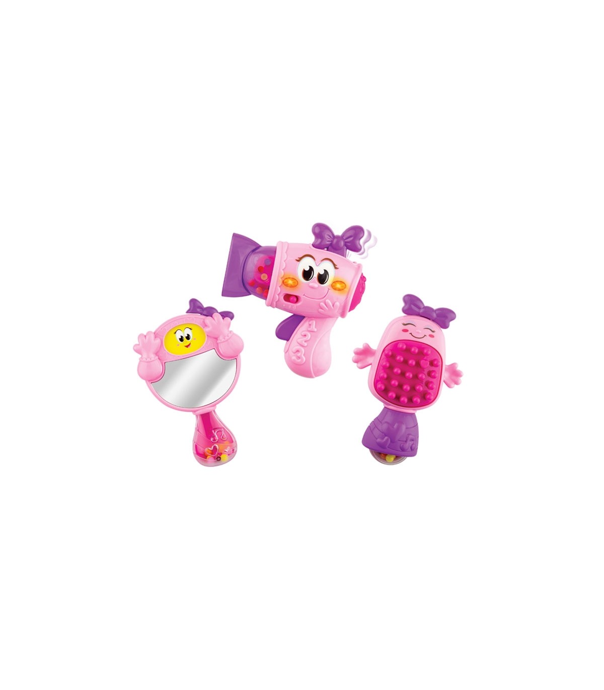 • دارای سشوار با صدای فن، آیینه طلقی ایمن، برس جغجغه‌ای، دکمه خاموش و روشن ، جلوه‌های صوتی و ملودی سرگرم کننده