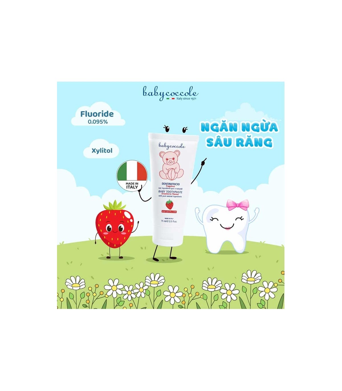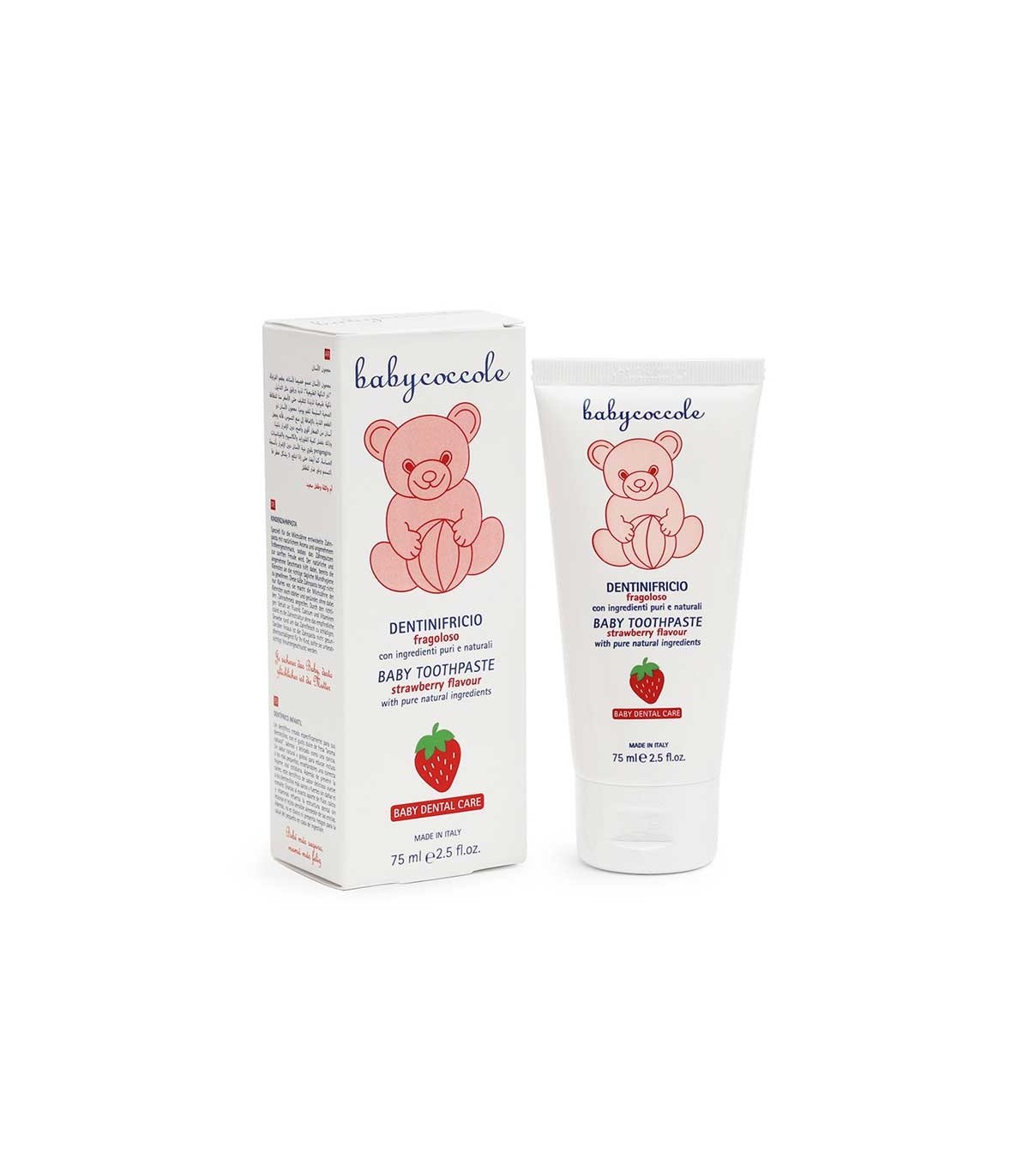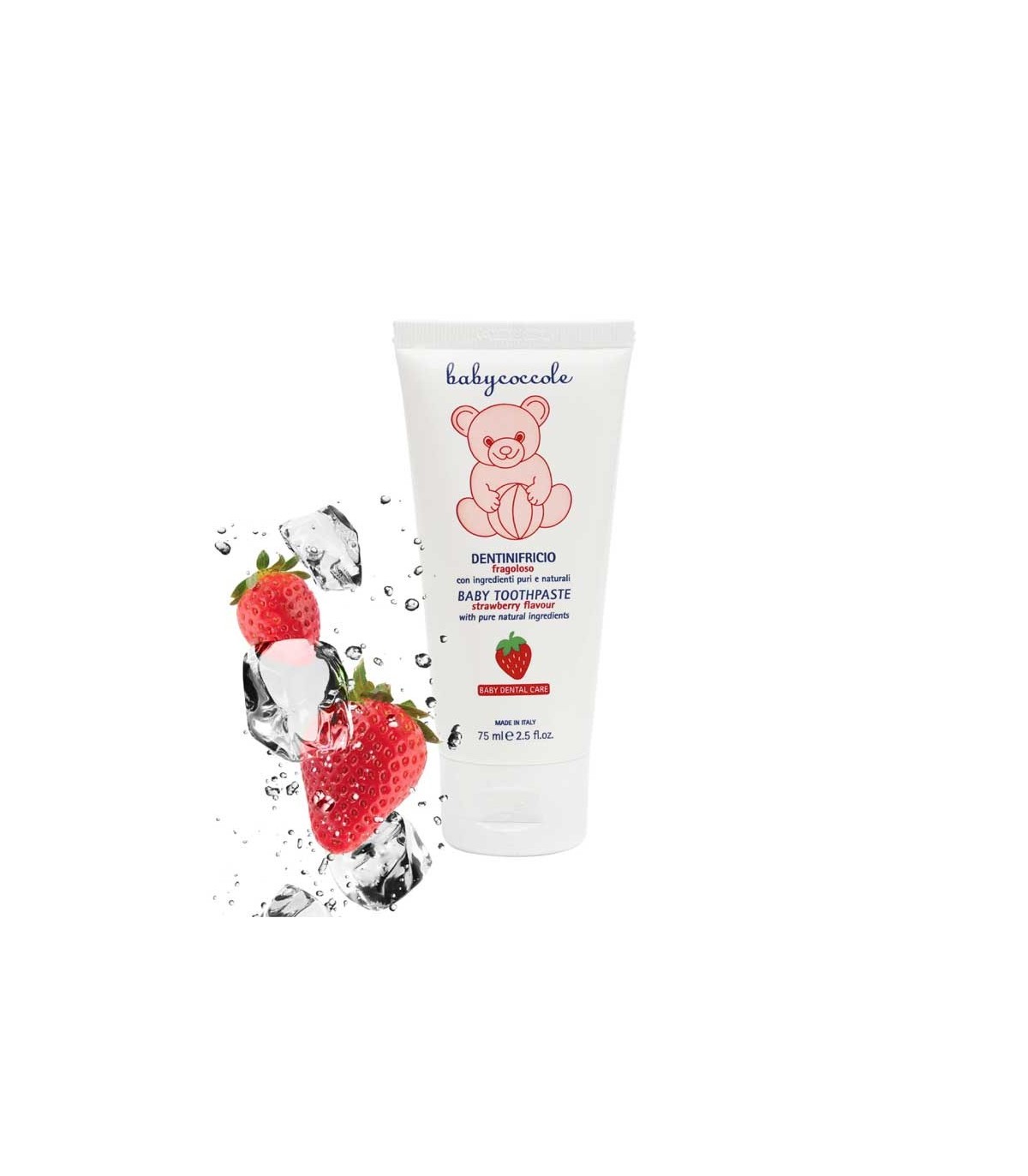 خمیردندان طبیعی بیبی‌کوکول ۷۵ میل دارای عصاره طبیعی توت‌فرنگی و غنی‌شده با کلسیم است.