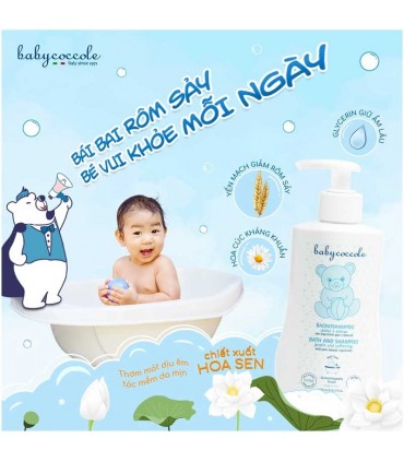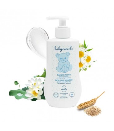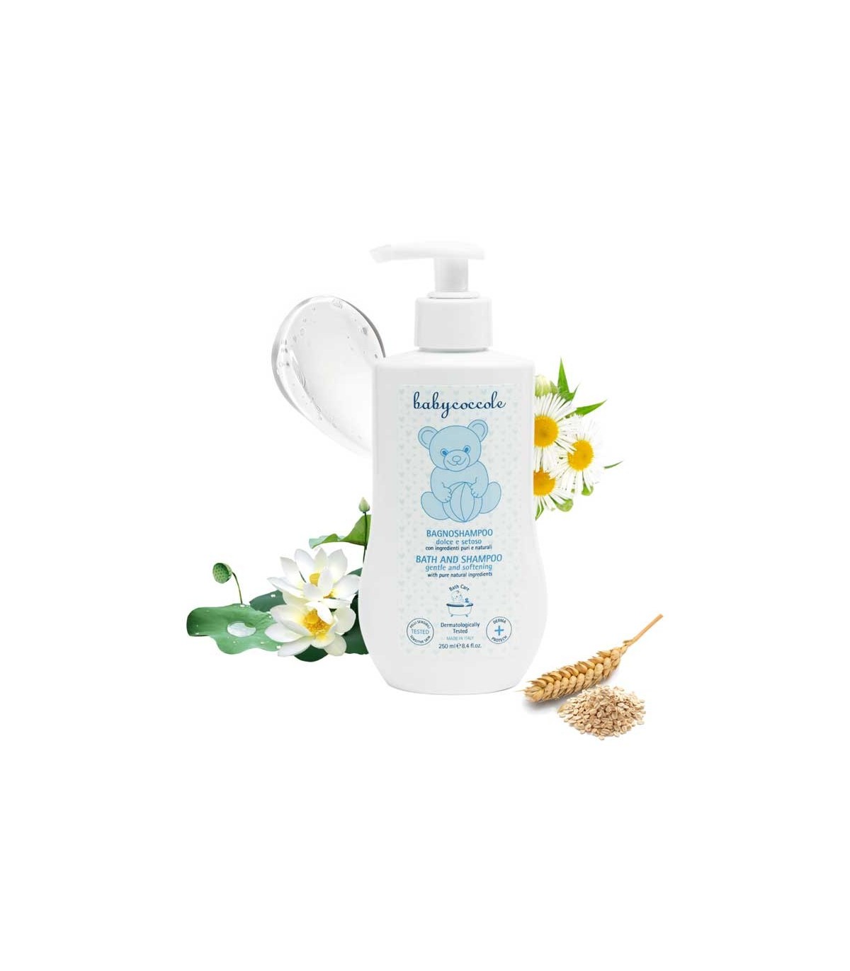 شامپو سر و بدن ۲۵۰ میل بیبی‌کوکول مناسب استفاده از بدو تولد و دارای بتاگلوکان‌های جو دوسر و بیسابولول بابونه و رایحه گل نیلوفر است.