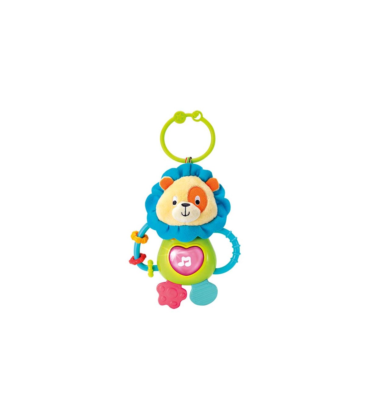 این محصول دارای آویز برای استفاده در کریر و کالسکه و حقه‌های نرم و رنگی برای سرگرم کردن کودک است. پاهای شیر به شکل دندان‌گیر طراحی شده و دلبند شما هنگام خارش لثه می‌تواند محصول را به دندان و لثه خود بکشد.