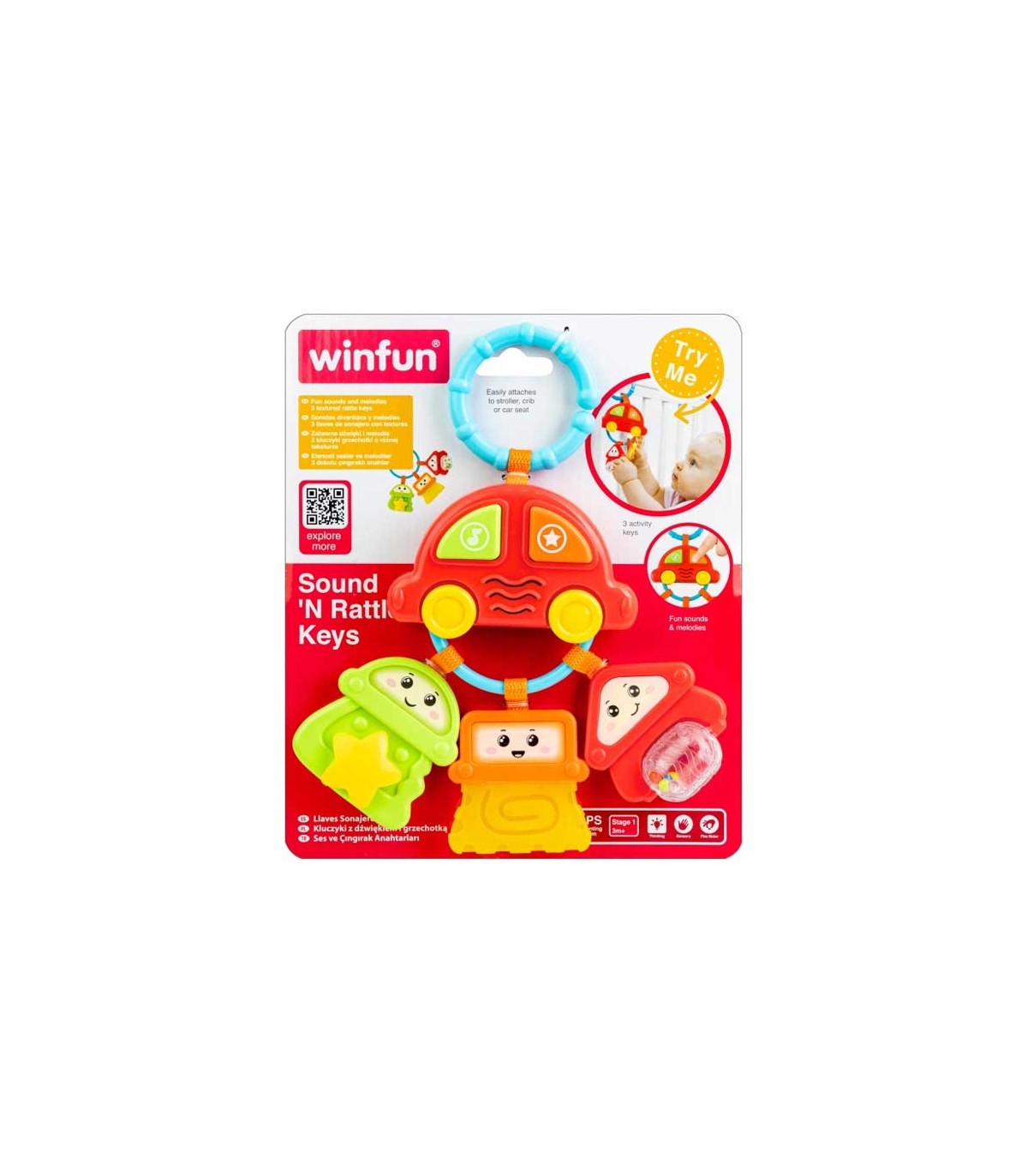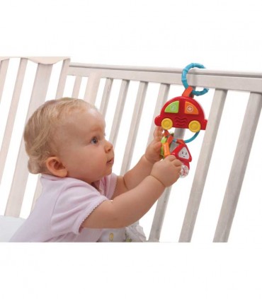 جغجغه آویز کلید وین‌فان شامل یک ماشین موزیکال و سه کلید جغجغه‌ای است. با فشار دکمه نارنجی رنگ روی ماشین ملودی‌هایی مثل بوق و استارت ماشین پخش می‌شود. با فشار دکمه سبز رنگ نیز نوزاد می‌تواند صدای حیوانات را بشنود. سه کلید متصل به ماشین هم دارای بافت برای لمس، مهره‌های رنگی و خورشید چرخان هستند. این محصول دارای حلقه آویز برای اتصال آسان به کالسکه و کریر است.