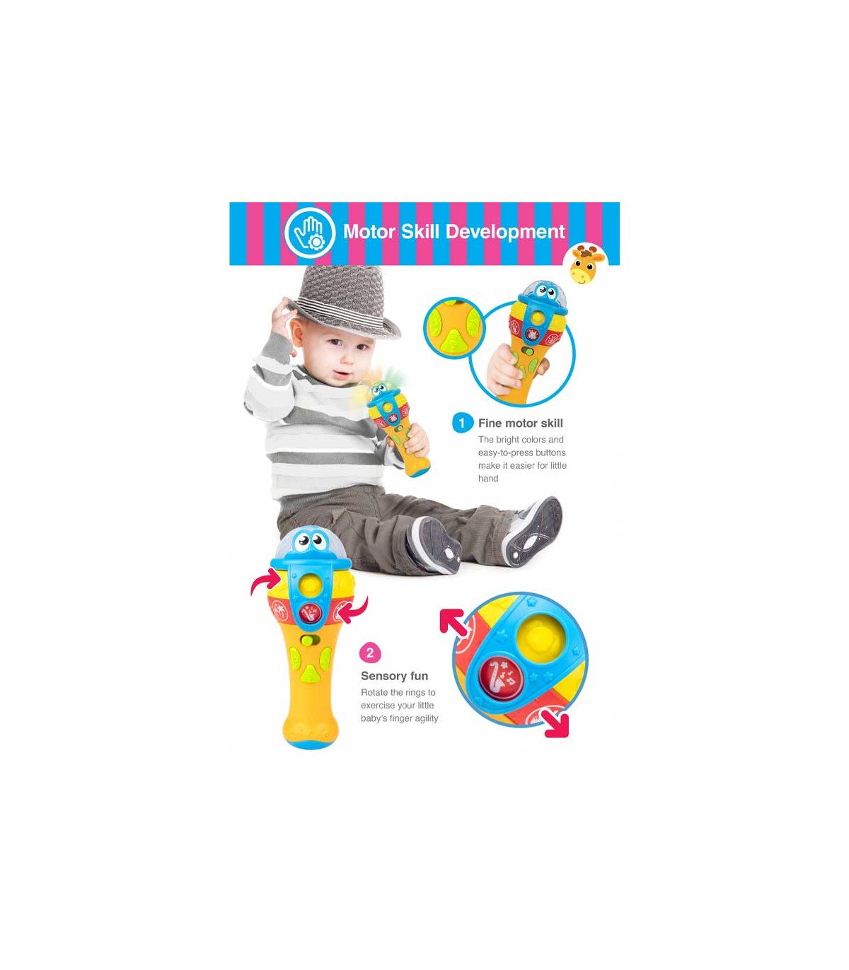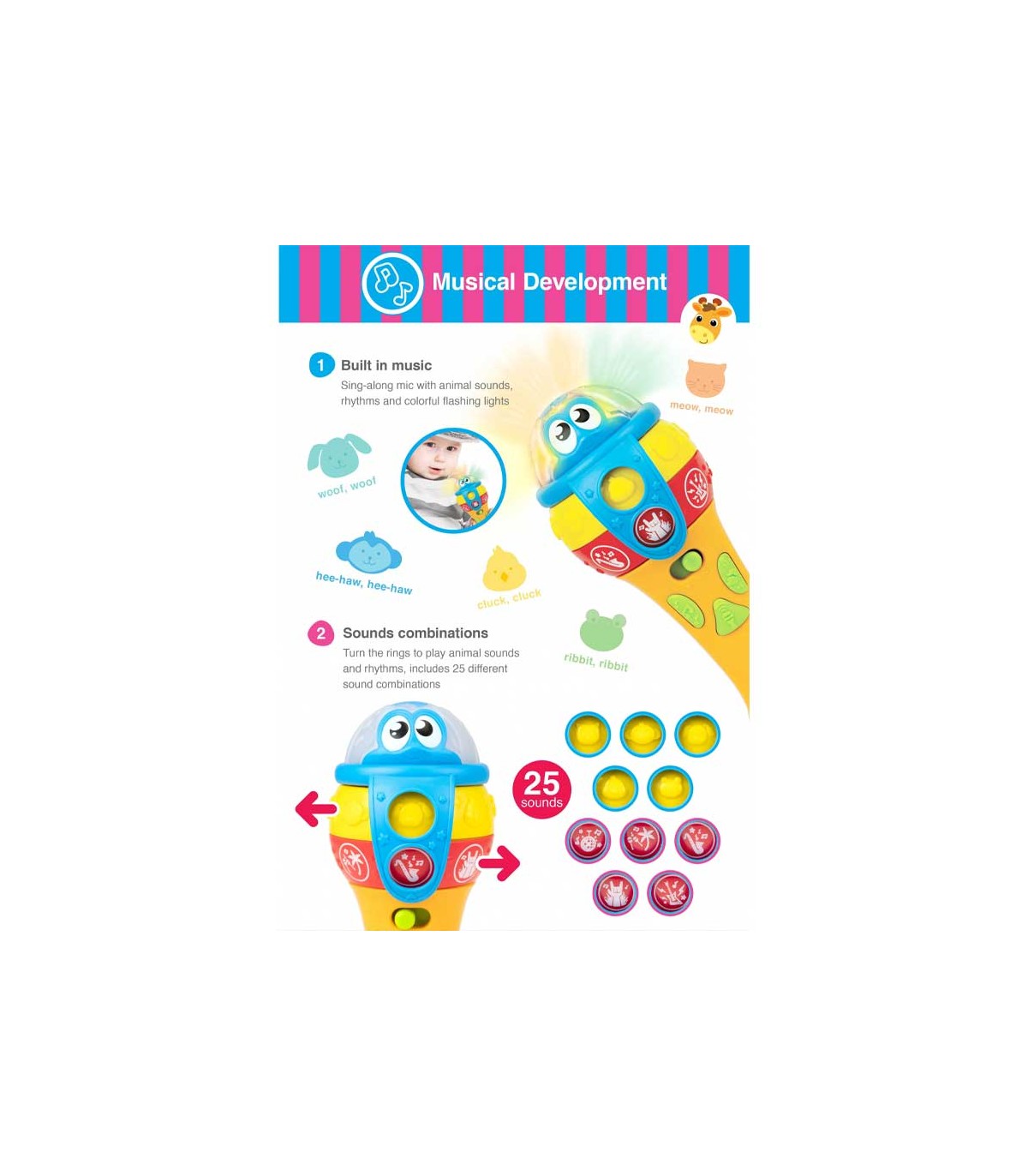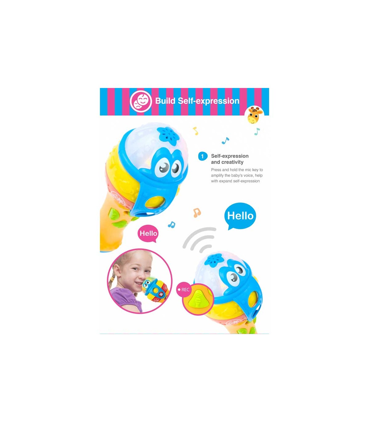 مهارت ابراز خود و مهارت‌های اجتماعی از همان دوران نوپایی در کودک شکل می‌گیرد. میکروفون موزیکال چندکاره وین‌فان یک محصول آموزشی برای تقویت این مهارت‌هاست. این میکروفون سرگرم‌کننده کودک را تشویق به صحبت و آواز خواند می‌کند. همچنین ملودی‌های مختلف، پخش صدای حیوانات و چراغ چشمک‌زن از دیگر امکانات این میکروفون است. محصول دارای دو افکت صدا است و با فشار و نگه داشتن کلید صدای کودک پخش می‌شود. برای استفاده از صداهای مختلف یا جلوه‌های نوری باید حلقه‌های روی میکروفون را بچرخانید.