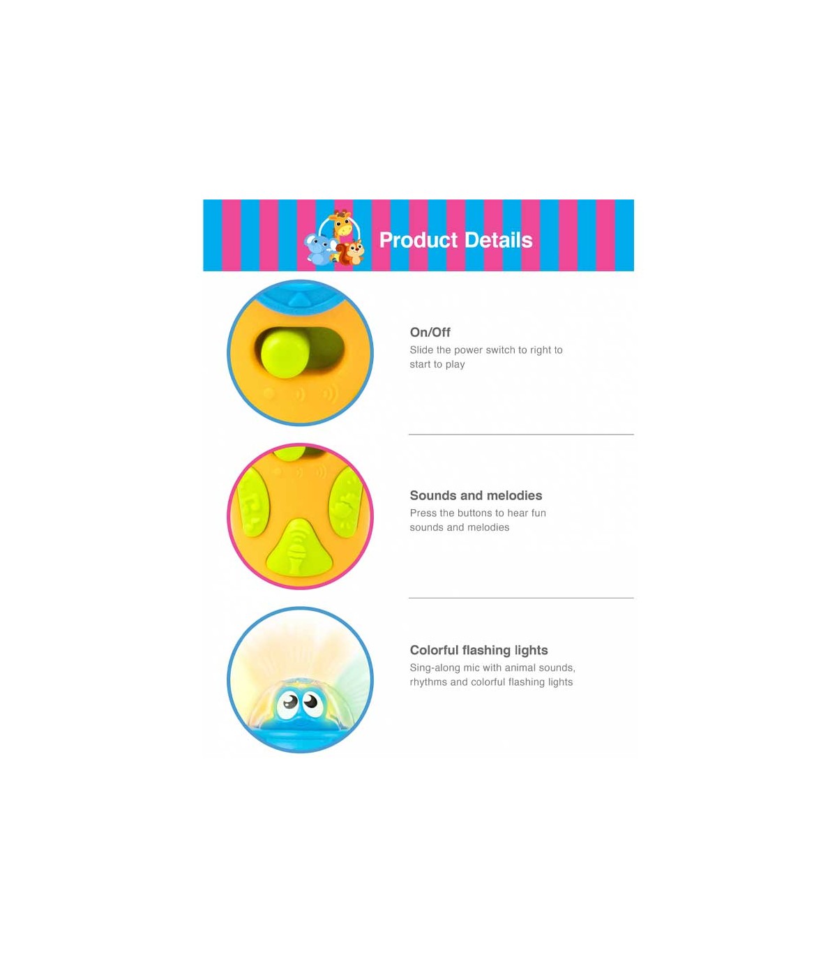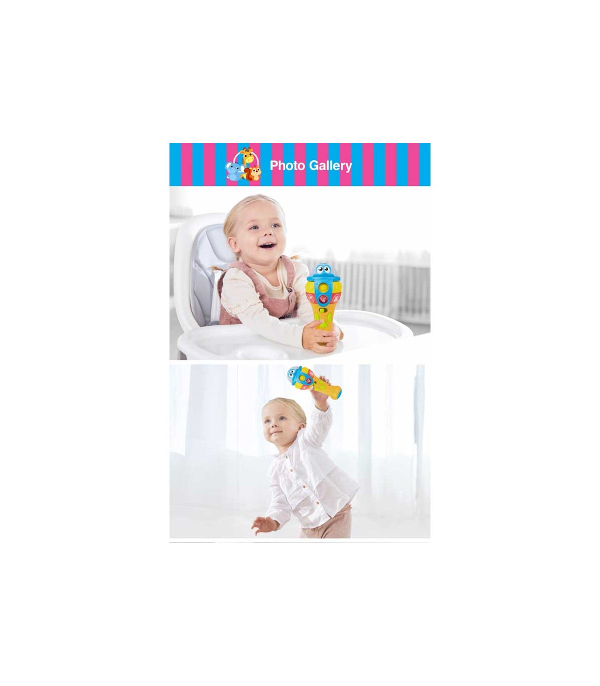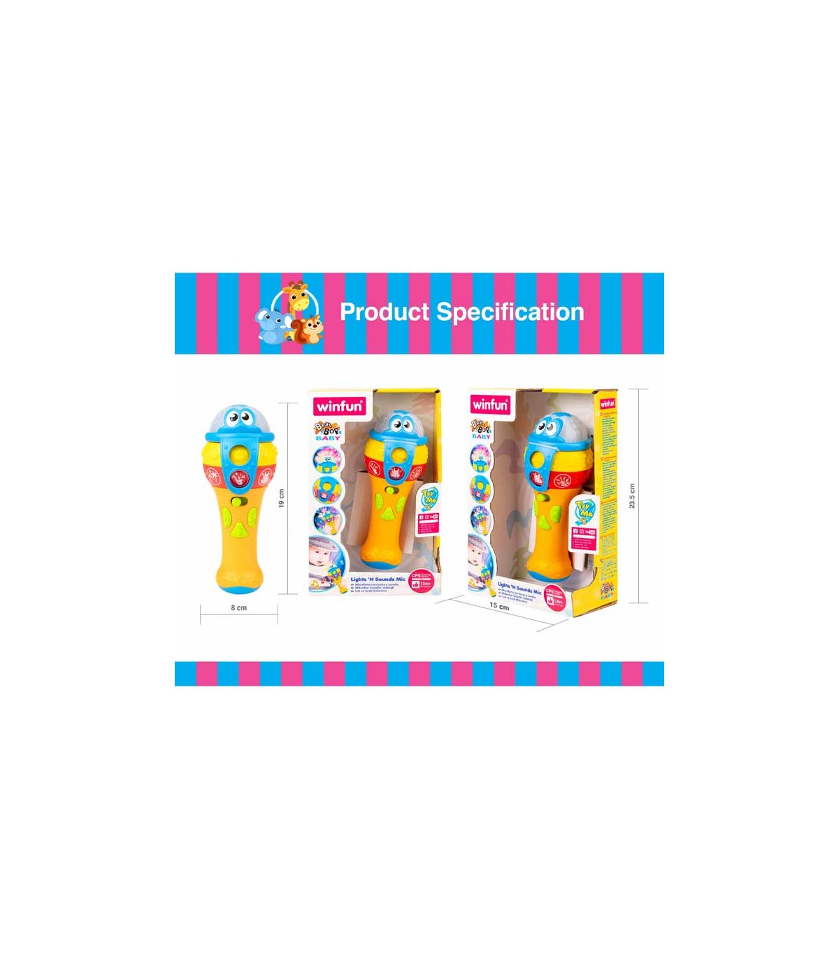 مهارت ابراز خود و مهارت‌های اجتماعی از همان دوران نوپایی در کودک شکل می‌گیرد. میکروفون موزیکال چندکاره وین‌فان یک محصول آموزشی برای تقویت این مهارت‌هاست. این میکروفون سرگرم‌کننده کودک را تشویق به صحبت و آواز خواند می‌کند. همچنین ملودی‌های مختلف، پخش صدای حیوانات و چراغ چشمک‌زن از دیگر امکانات این میکروفون است. محصول دارای دو افکت صدا است و با فشار و نگه داشتن کلید صدای کودک پخش می‌شود. برای استفاده از صداهای مختلف یا جلوه‌های نوری باید حلقه‌های روی میکروفون را بچرخانید.