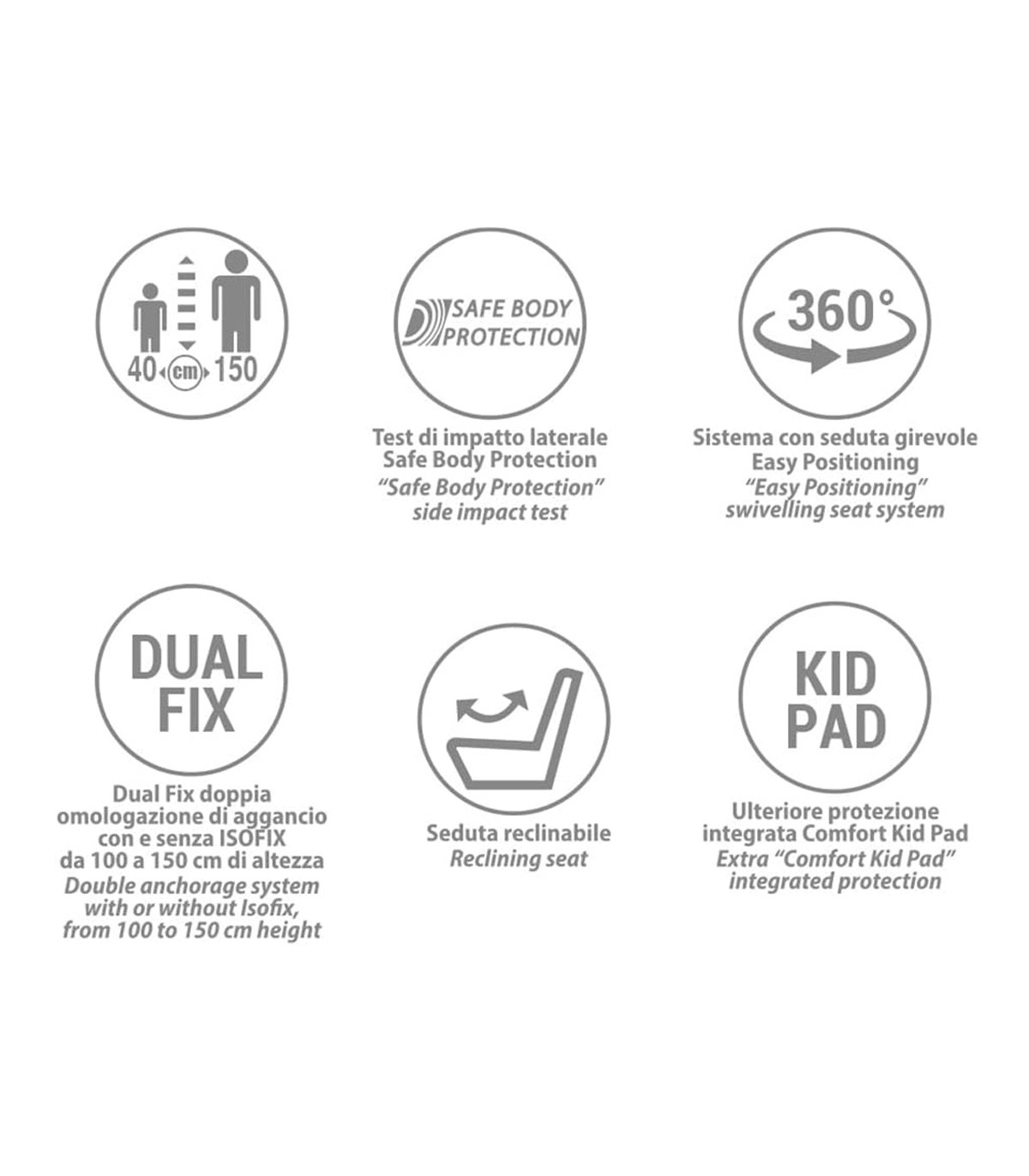 صندلی ماشین کودک Clock فوپاپدرتی دارای استاندارد I-SIZE و سیستم چرخشی آسان است. این محصول از بدو تولد تا سن ۱۲ سالگی کودک قابل استفاده است.