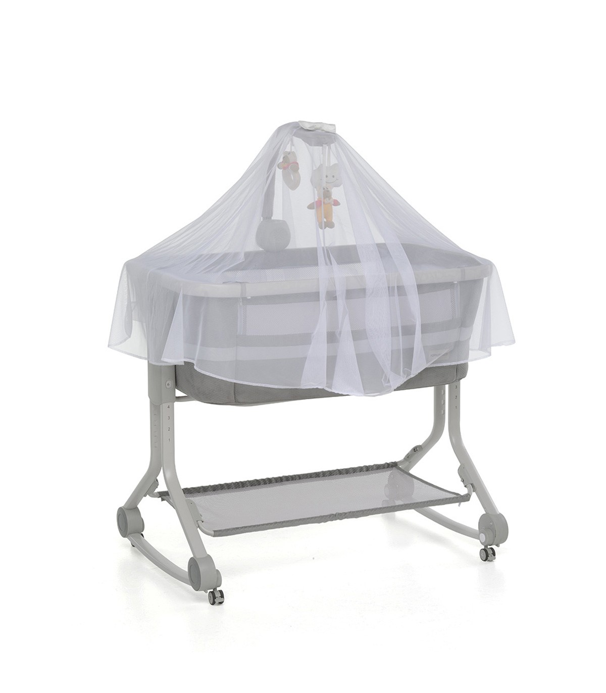 تخت نوزاد کنار مادر Mybebe با طراحی شیک و مینمال قابل تبدیل به راکر و تنظیم در ۶ ارتفاع مختلف است.