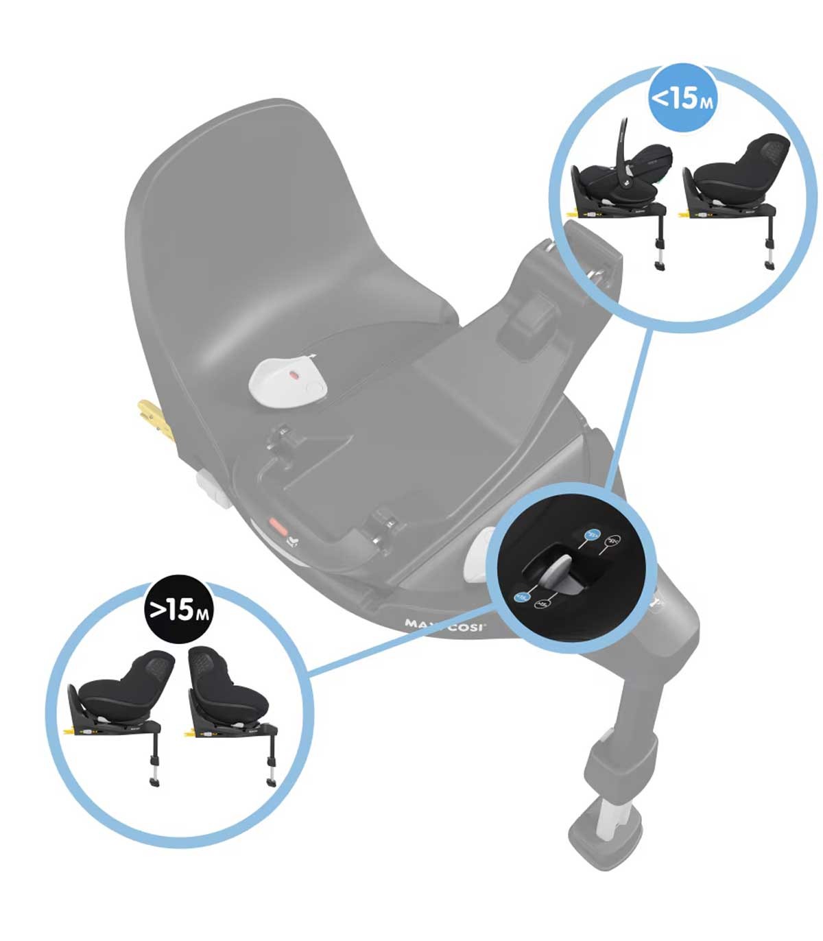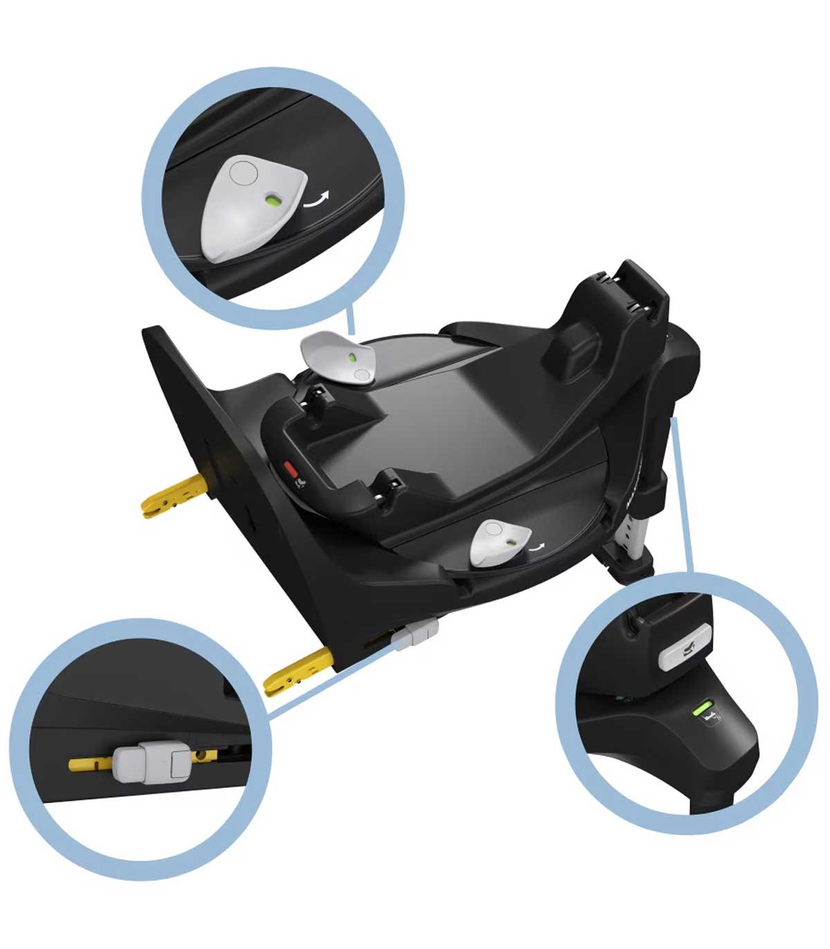 بیس دارای نشانگر بصری است که به شما نشان می‌دهد صندلی ماشین کودک را صحیح نصب کرده‌اید یا خیر. امکان قفل چرخشی در موقعیت نصب رو به عقب خیال شما را از پایدار بودن صندلی در این موقعیت راحت می‌کند.