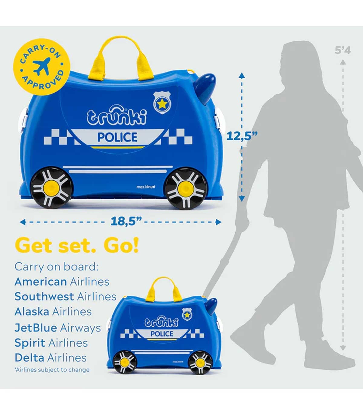 چمدان دستی کودک ترانکی مدل پلیس سبک وزن است و کودکان تا وزن ۵۰ کیلوگرم به راحتی می‌توانند سوار آن شوند تا یک سفر هیجان‌انگیز را تجربه کنند.