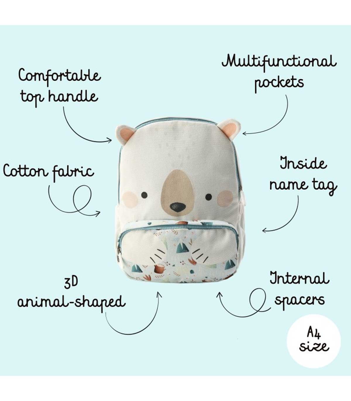 کوله‌پشتی طرح خرس قطبی سایز بزرگ (A4) مناسب استفاده در پیش‌دبستانی است.