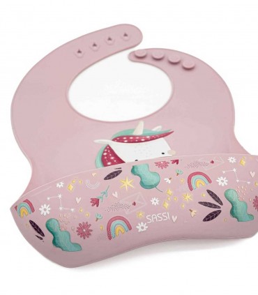 پیشبند ساسی طرح پونی یک انتخاب هوشمندانه برای شروع غذای کمکی دلبند شما است. این پیشبند از جنس سیلیکون استاندارد برای مصرف مواد غذایی است. شستشوی آسانی دارد و به راحتی می‌توانید آن را در ماشین ظرف‌شویی قرار دهید. طراحی یک جیب بزرگ در پایین پیشبند به منظور نگه‌داشتن مواد غذایی که ممکن است از دست کودک سر بخورد بسیار کاربردی است و از ایجاد آشفتگی جلوگیری می‌کند. این محصول ساسی در قسمت یقه قابل تنظیم برای جثه کودک است و در دوره‌های مختلف رشد کودک می‌توانید آن را استفاده کنید. با همراهی پیشبند جذاب ساسی فرآیند شروع غذای کمکی همراه با آرامش بیشتری است.