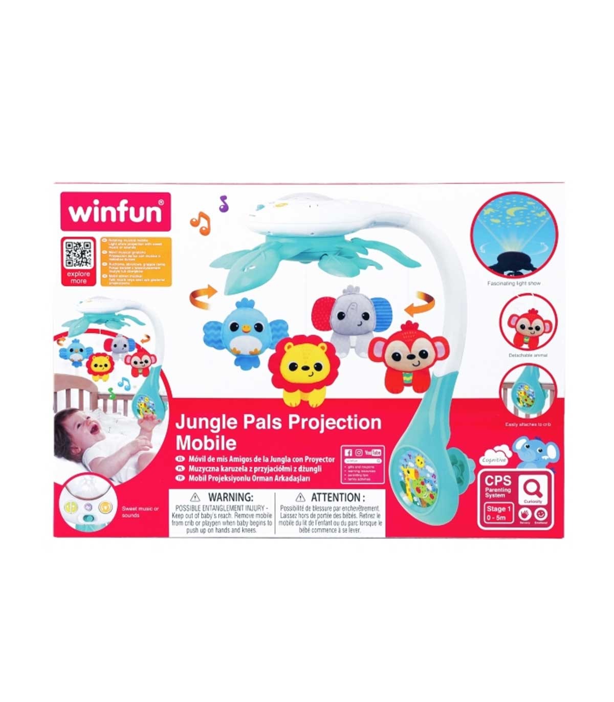 همچنین با فشار دادن دکمه پروژکتور، نورهای رنگی را روی دیوار یا سقف اتاق مشاهده می‌کنید. آویز چرخان وین‌فان 360 درجه می‌چرخد و توجه کودک را جلب می‌کند. 4 حیوان بامزه هم به آویز متصل هستند و کودک تلاش می‌کند تا آن‌ها را بگیرد و لمس کند.  بنابراین حواس بینایی و شنوایی و لامسه کودک در حین بازی با این آویز درگیر می‌شود و رشد مضاعف می‌کند.