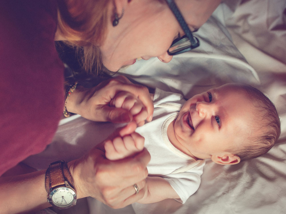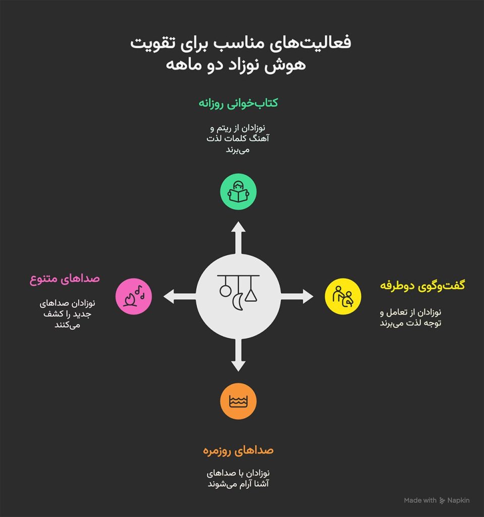 • پاسخ به آواهای کودک: وقتی بچه دو ماهه صداهایی مثل قان و غون تولید می‌کند، با لبخند، هیجان و صحبت، به او پاسخ دهید تا حس تعامل و برقراری ارتباط در او تقویت شود.