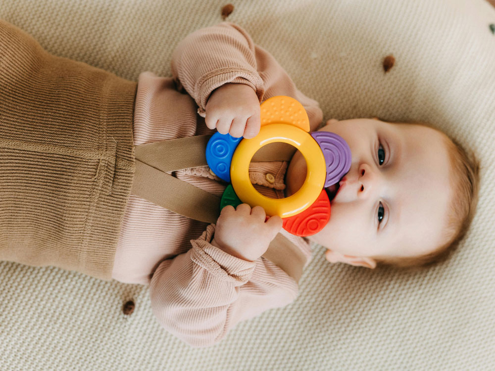 • جغجغه: انواع مختلف جغجغه نوزاد، مخصوصا جغجغه پارچه‌ای که به مچ بسته می‌شود، کودک را تحریک به حرکات مختلف دست و پا می‌کند. همچنین دلبند شما کنجکاو می‌شود منبع صدا را کشف کند. بنابراین تمام حواس او درگیر می‌شود.