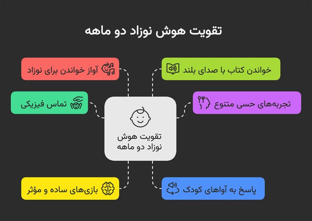 از روز اول تولد نوزاد می‌توانید با انجام یکسری فعالیت روزمره به تحریک رشد مغزی نوزاد کمک کنید. حتی کتاب‌هایی با همین عنوان در بازار وجود دارند که می‌توانید تهیه کنید. فهرستی از فعالیت‌های روزانه که به تقویت هوش نوزاد دو ماهه منجر می‌شود را در ادامه با هم مرور می‌کنیم: