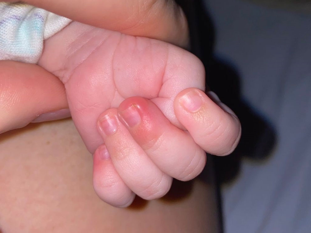 اگر این اتفاق افتاد حتما با پزشک اطفال موضوع را مطرح کنید تا کرم موضعی مناسب را برای نوزاد شما تجویز کند. انگشت کودک را در آب گرم خیس کنید و پس از استفاده از کرمی که دکتر تجویز میکند، دستکش نخی دست کودک کنید تا انگشت را میک نزند.