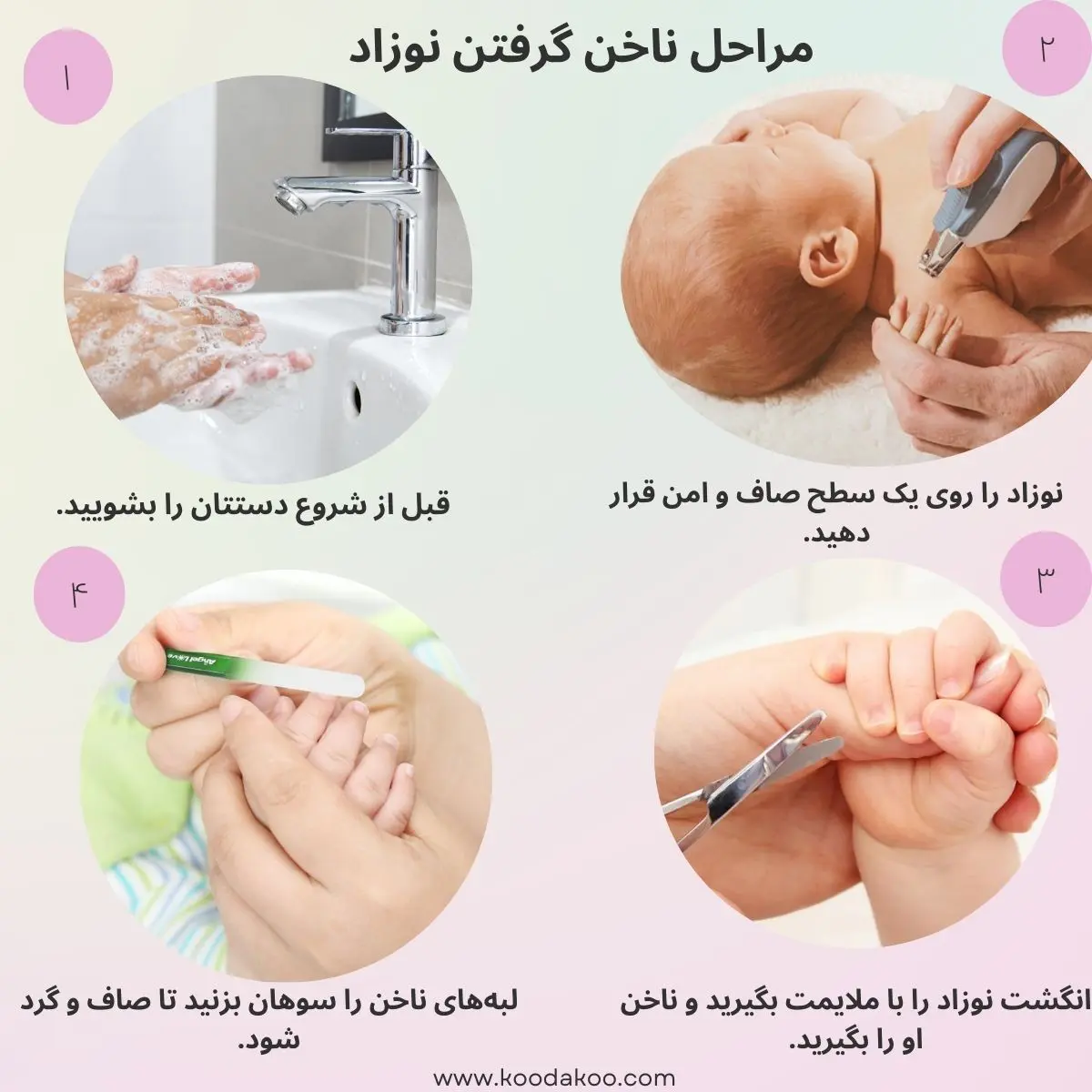 ناخن نوزاد را هر وقت که بلند است بگیرید. گرفتن ناخن کودک باید زود به زود انجام شود. رشد ناخن دست نوزادان نسبت به بزرگسالان سریعتر است. اما رشد ناخن پای آنان نسبت به دستان این کوچولوهای دوست داشتنی سرعت کمتری دارد.